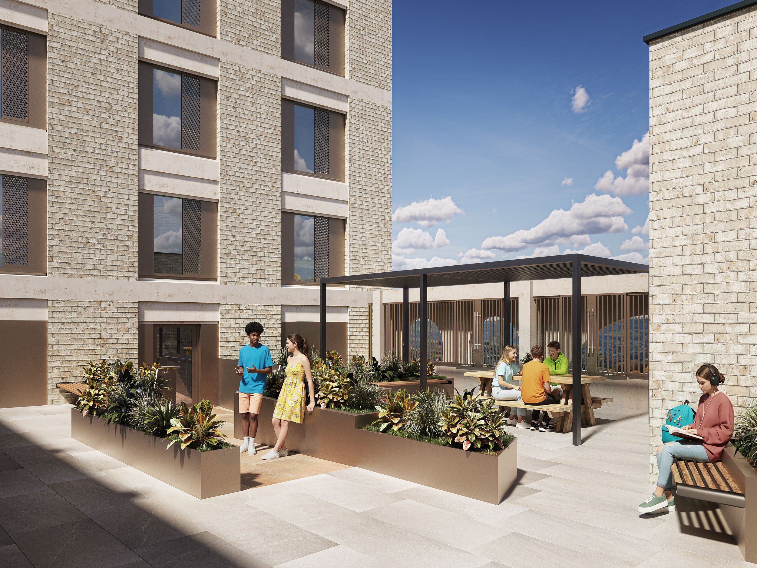 The ground floors and roof levels feature beautiful, well-considered archways and round windows, allowing the paved and bound gravel walkways of the courtyard to flow between and through the buildings and out to the public footpaths and cycle routes.
