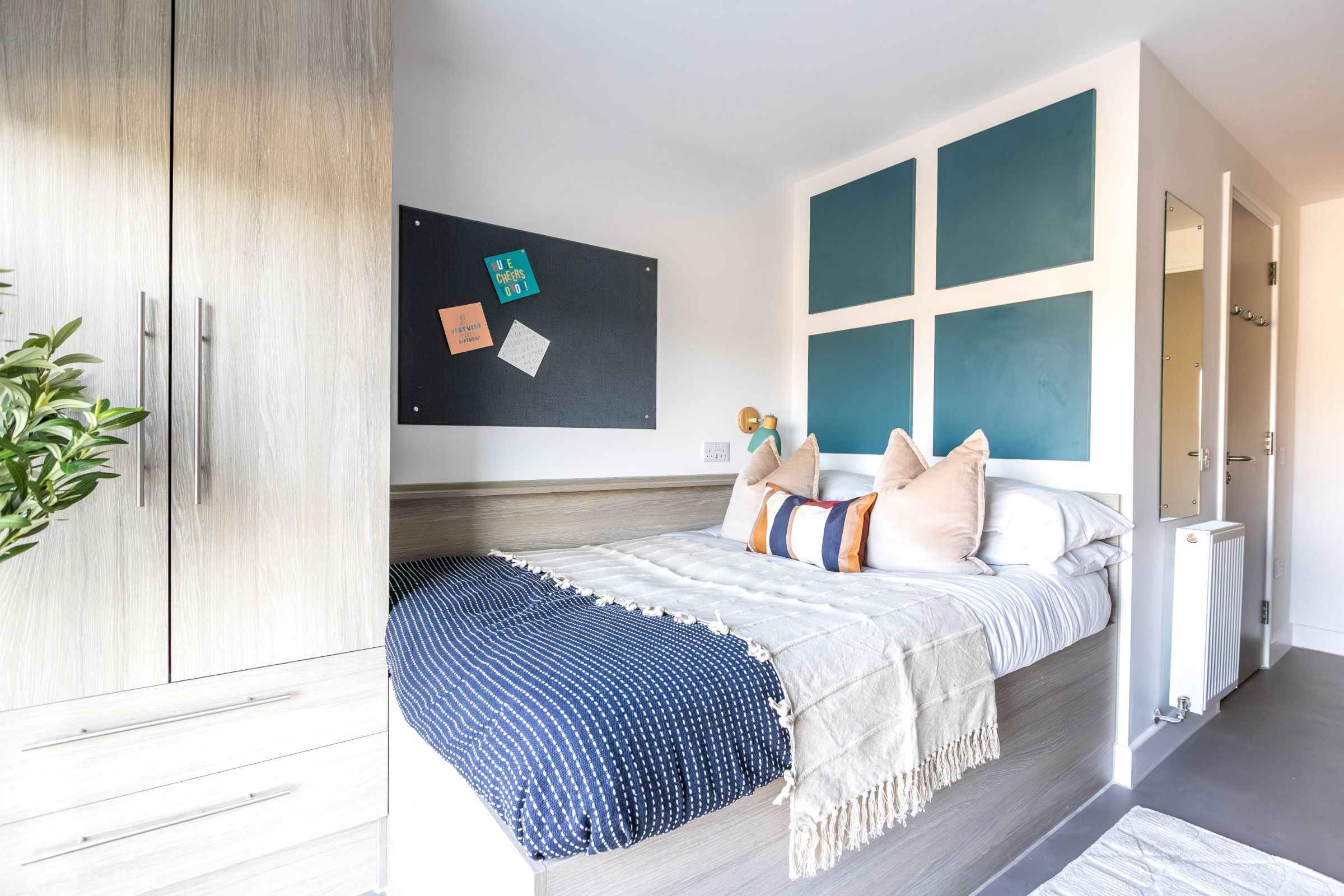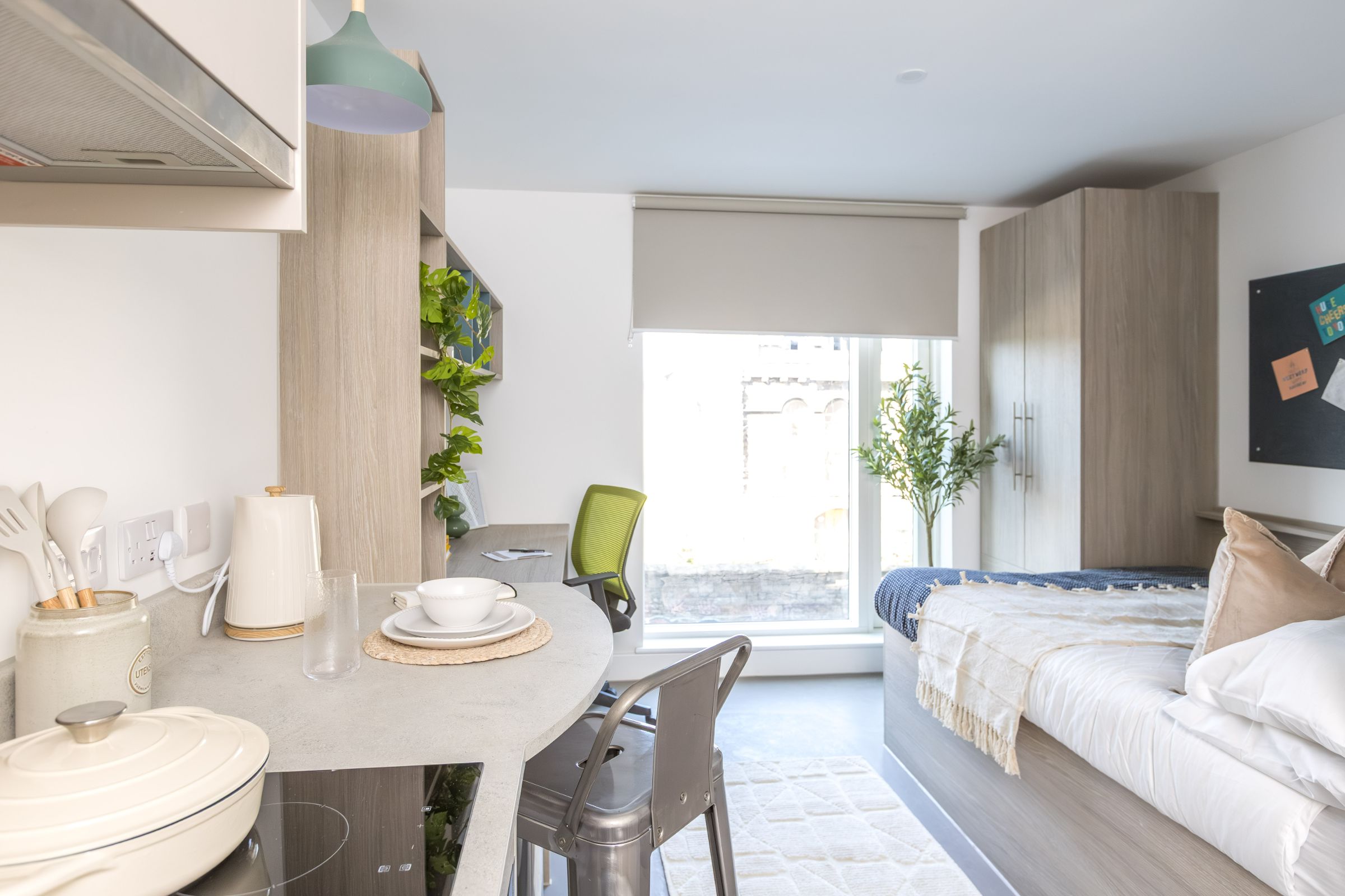 There are 706 premium studios, standard studios and ensuite rooms to choose from, spread across the complex. They are light and bright, with a double bed (some premium studios have king size beds), underbed storage, double wardrobe, chest of drawers, large showers, shelving, pinboards, and a desk with ergonomic chair, all provided as standard. The studios also have their own kitchen and eating areas.